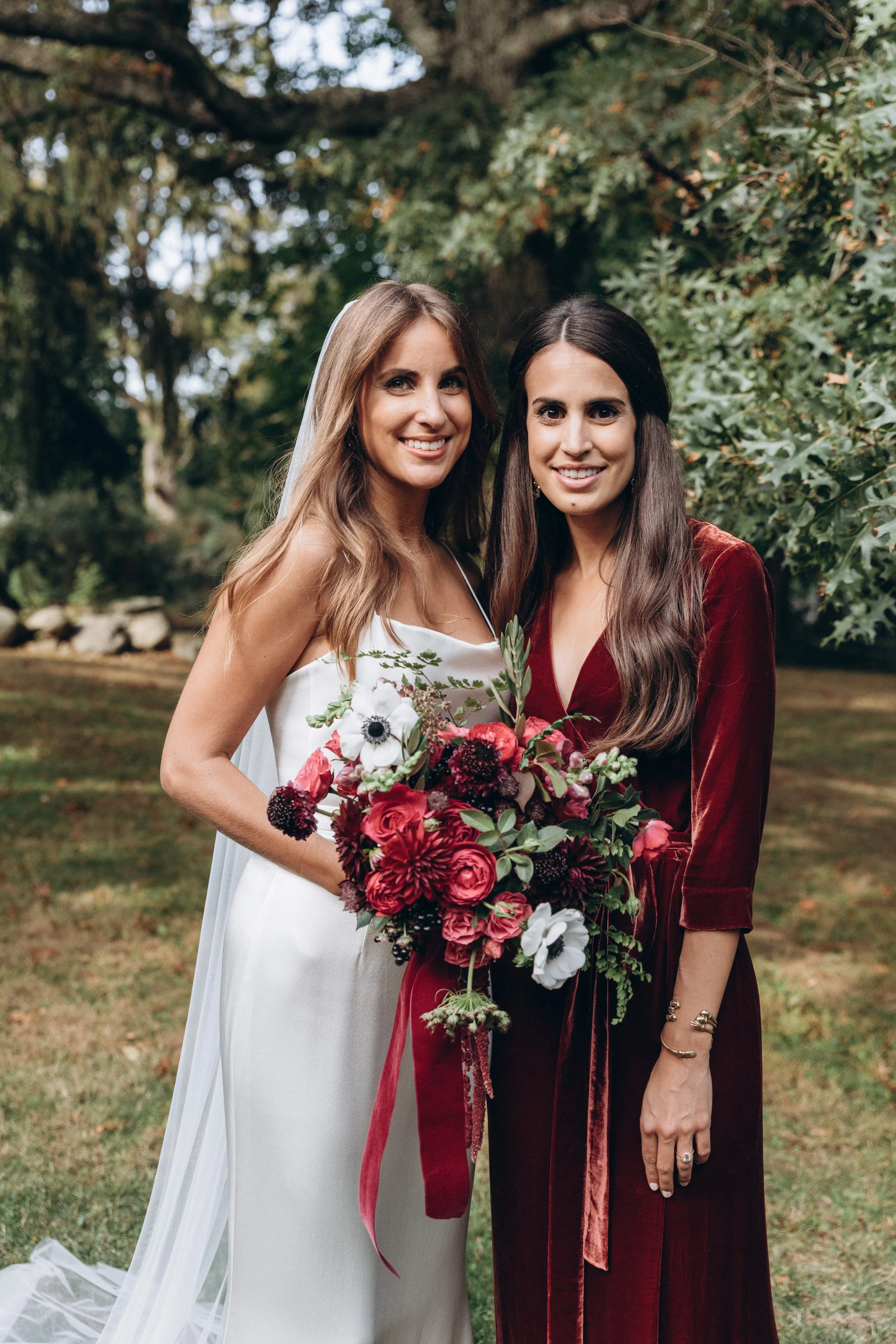 The result? A bouquet that felt garden-inspired but still editorial — rich, romantic, and striking against the groom’s velvet black suit. The colors played beautifully with the setting: early fall leaves just starting to shift, the inn’s creamy clapboard siding, and the natural wood tones of the ceremony chairs.