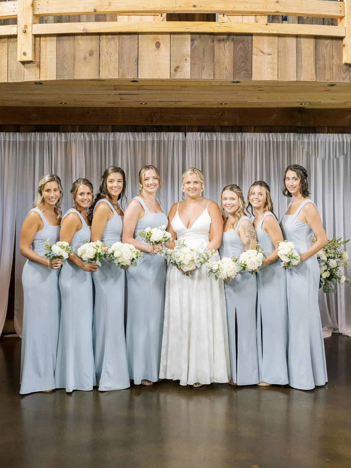 Her bridesmaids, in their pale blue dresses with square necklines, were the perfect complement to her look. The soft blue fit seamlessly into the wedding’s color palette, and the overall vibe was relaxed elegance. I love when bridesmaids' dresses look flattering and cohesive but still feel wearable—like, these were dresses you’d actually want to wear again.
