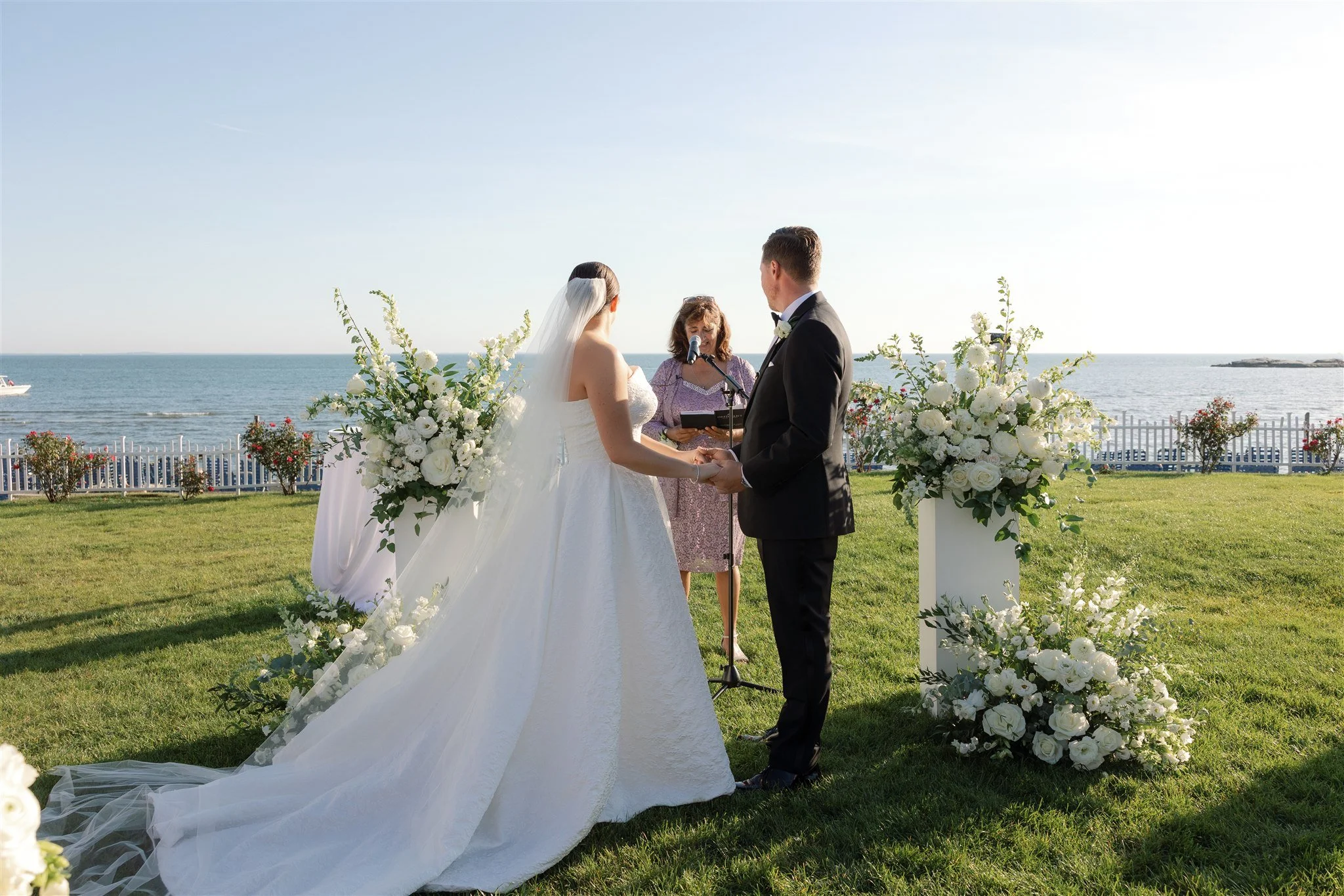This celebration unfolded in a palette of pure white, designed with an emphasis on form, movement, and light. On the ceremony lawn, two architectural columns framed the shoreline, each crowned with airy, reaching florals and grounded by meadow-style compositions that softened the structure. The effect was striking—refined silhouettes set against a hazy blue horizon, creating a moment that felt more fashion editorial than traditional ceremony.